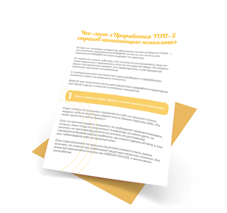 Зарегистрируйтесь прямо сейчас и получите чек-лист «Проработка ТОП-5 страхов начинающего психолога»